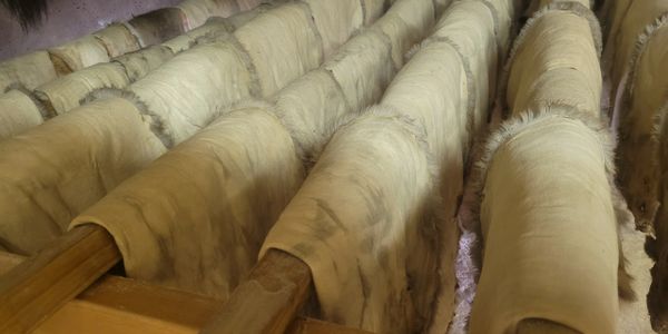 After the hides are dried we tumble them in a mixture of corn cob grit and mineral spirits to soften them up. The last step we do is cage the hides to clean out the hair and leather side.